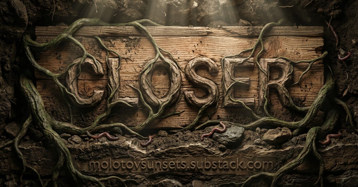 The scream comes up before I can stop it. It hits the lid and comes back and I’m choking on it, on the thick air, on the reality of what’s pressed against me. I thrash. The coffin doesn’t care. My elbow hits something that yields like packed clay, something that makes a sound like settling meat.