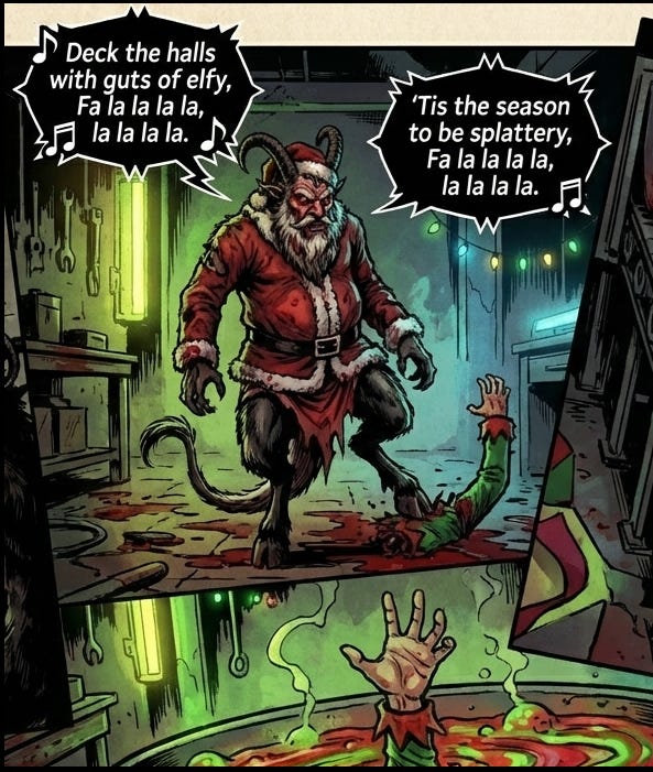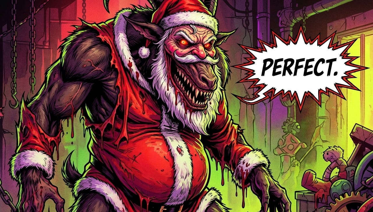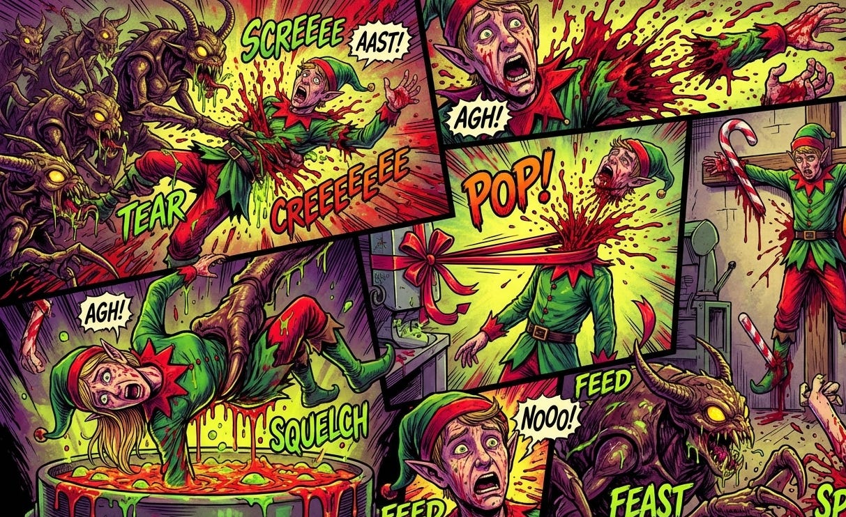 Content Warning: This splatterpunk Christmas catastrophe contains extreme graphic violence, gore, torture, body horror, dismemberment, evisceration, skinning, impalement, blunt force trauma, crushing injuries, death by machinery, death by molten plastic, death by ribbon strangulation, decapitation, cannibalism, harm to children, harm to elves, harm to Santa Claus, harm to reindeer (implied), mass extinction events, bioterrorism via Christmas presents, spore-based body horror transformations, explicit descriptions of organ failure, prolonged suffering, psychological torture, workplace horror, mentions of child labor and exploitation, anti-capitalist rage given physical form, the complete destruction of Christmas mythology, jokes sung over corpses, deliberate cruelty presented as justice, nihilistic philosophy, zero redemption arcs, no happy endings, the systematic punishment of literally everyone for the crime of being human, and enough yuletide carnage to permanently ruin your ability to hear โDeck the Hallsโ without flashbacks.