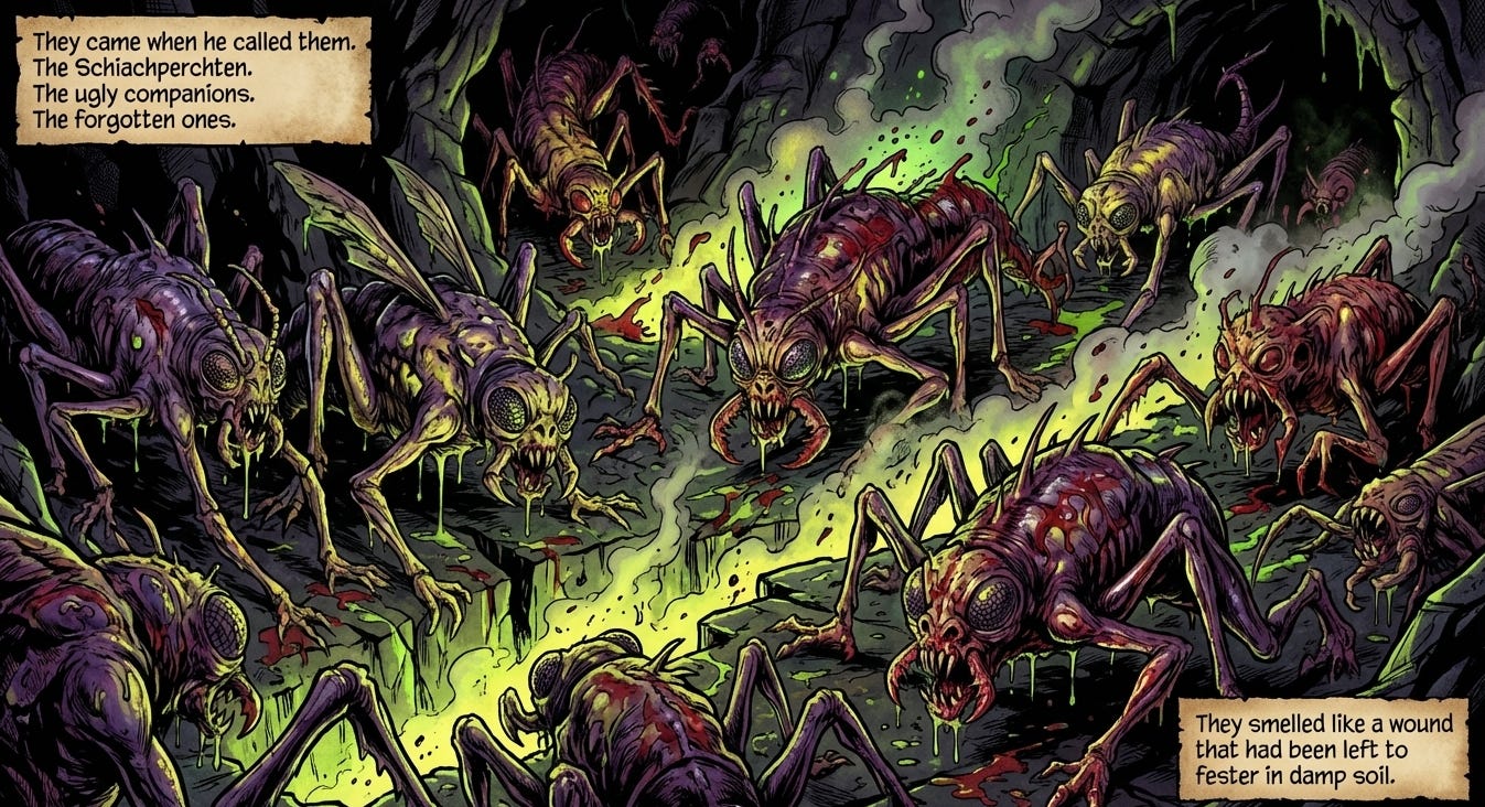 More followed. Dozens. Hundreds. They poured from cracks in the stone, from shadows that should not have been deep enough to hold anything, from the darkness itself. They filled the cave floor in a chittering, skittering carpet of wrongness. They smelled like wet earth and rotting meat and something chemical, something that burned the inside of the nose.