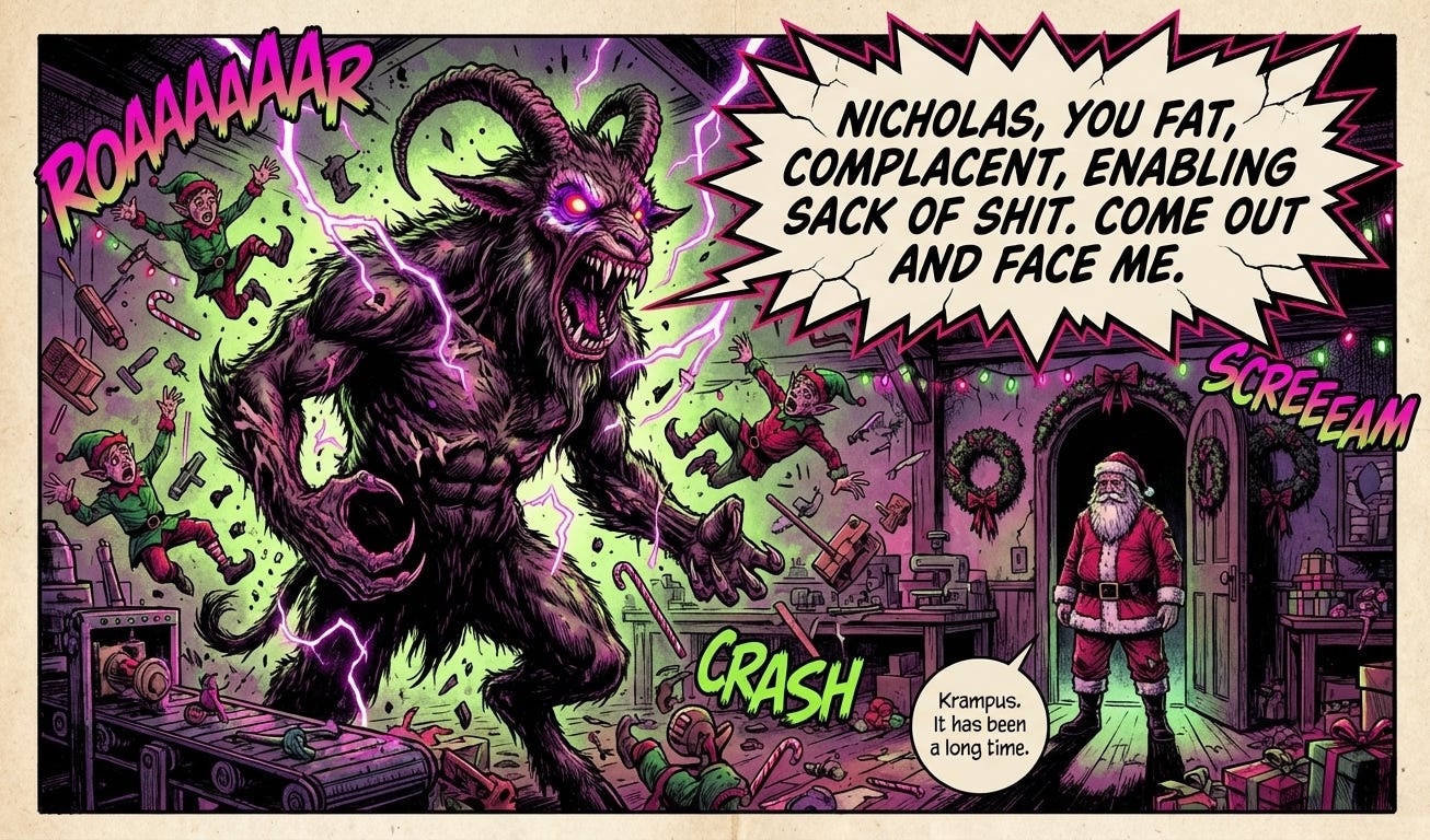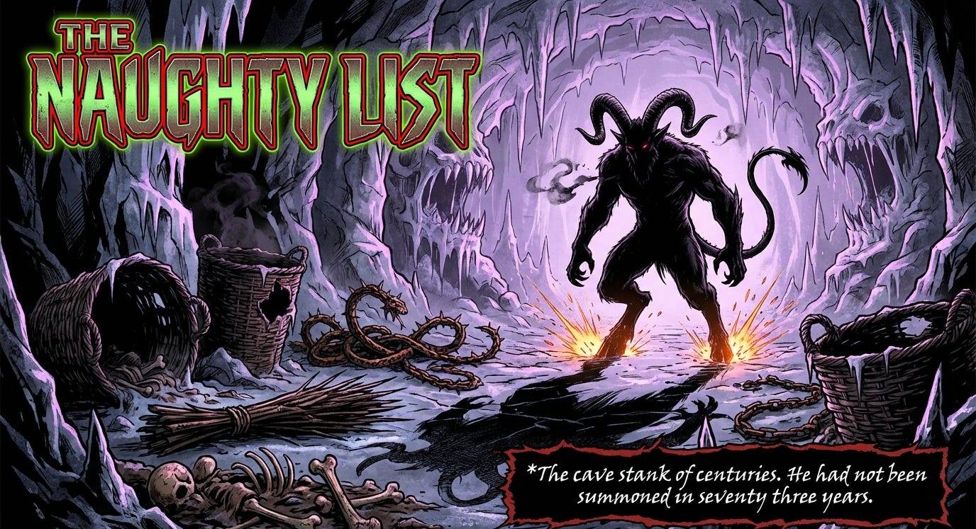 Krampus paced the frozen stone, his hooves striking sparks that died in the darkness. Around him, the accumulated detritus of twelve hundred years of punishment lay in heaps and piles. Birch switches bundled with leather straps, their tips sharpened to draw blood. Chains rusted the color of old scabs, still flecked with skin from children who had died before electricity existed. Wicker baskets large enough to hold a screaming body. And bones. So many bones. Small ones, mostly.