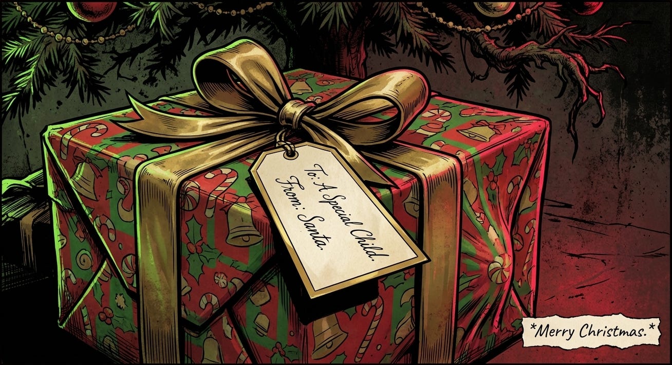 A single wrapped present under a tree, nestled among the others, indistinguishable from the rest. The paper is red with green trim. The bow is gold. The tag reads: โTo: A Special Child. From: Santa.โ